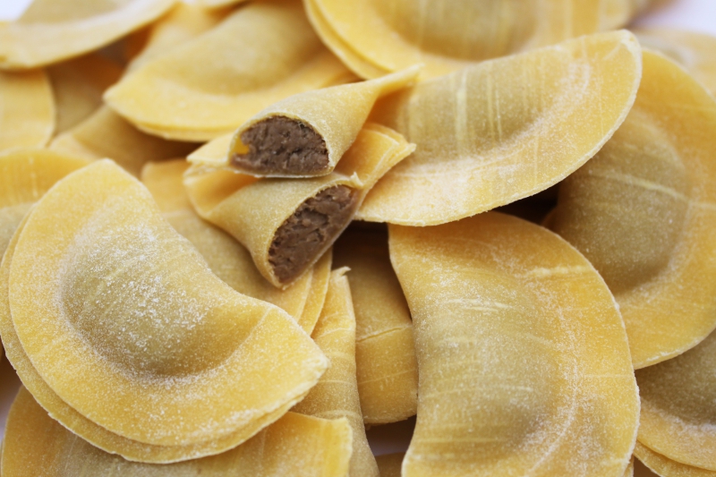 | Složení: | Pšeničná semolin. mouka z tvrdé pšenice 60% hm., pasterované vejce 20%hm., pitná voda, rýž. mouka 2%hm. Složení náplně: Zvěřina mix 80%, brusinky, červ. víno, koř. zelenina, vejce, parmazán a strouhanka |